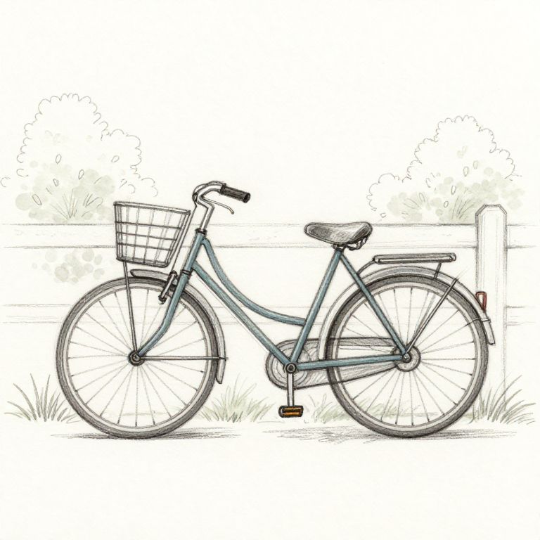 Easy art sketch of a vintage bicycle leaning against a fence, rough pencil outlines, simplified spokes and basket detail, subtle nature elements in background with bushes and grass, light and airy composition, perfect for beginner art practice.