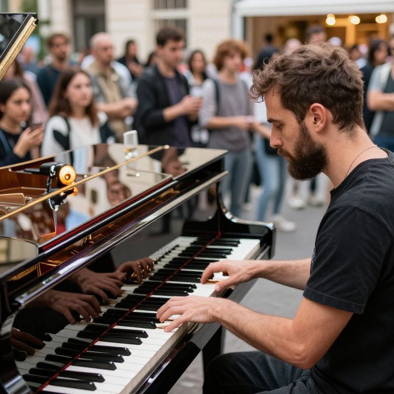 Photograph of a bearded, dark-haired man with a medium build, wearing a black t-shirt, playing a glossy black grand piano in an outdoor urban setting. His focused expression contrasts with the blurred background of a diverse crowd of casually dressed people, some clapping and others watching. The piano's reflective surface shows parts of the crowd. The setting has bright, natural light, with visible storefronts and people in the background, creating a lively atmosphere. The image has vibrant colors and a shallow depth of field, emphasizing the pianist and piano.