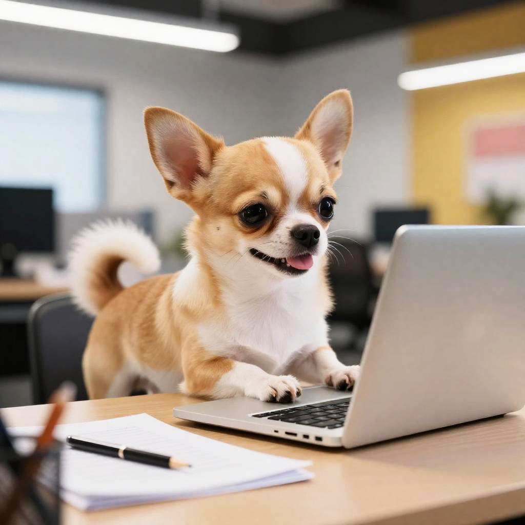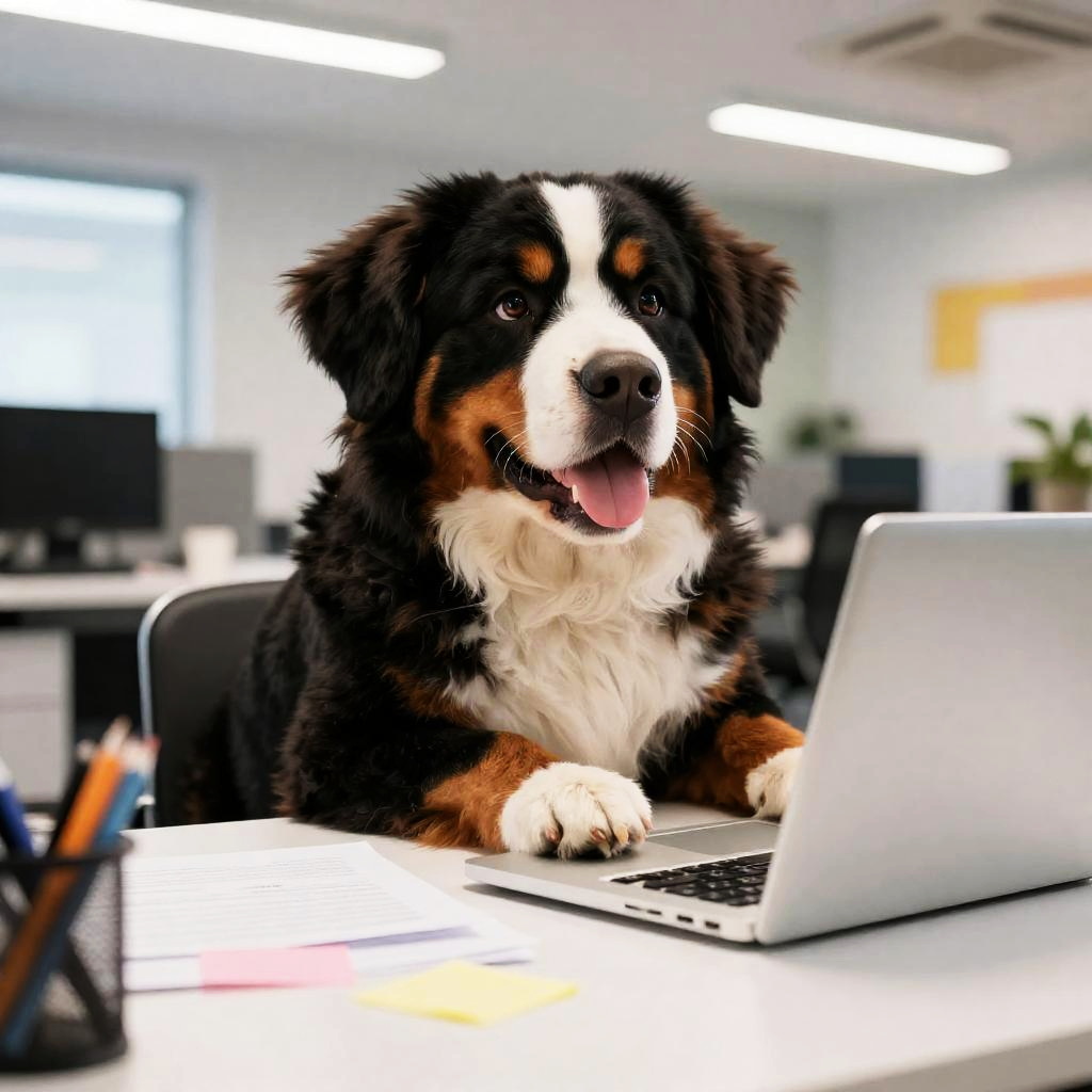 Black and tan German shepherd working on a laptop, with sheets of paper and stationery on the office table, bright and colorful, cheerful atmosphere, detailed office background, modern office layout, vibrant overhead lighting, high resolution, ultra-detailed, 4K quality, dynamic perspective, friendly and engaging, professional cartoon style
