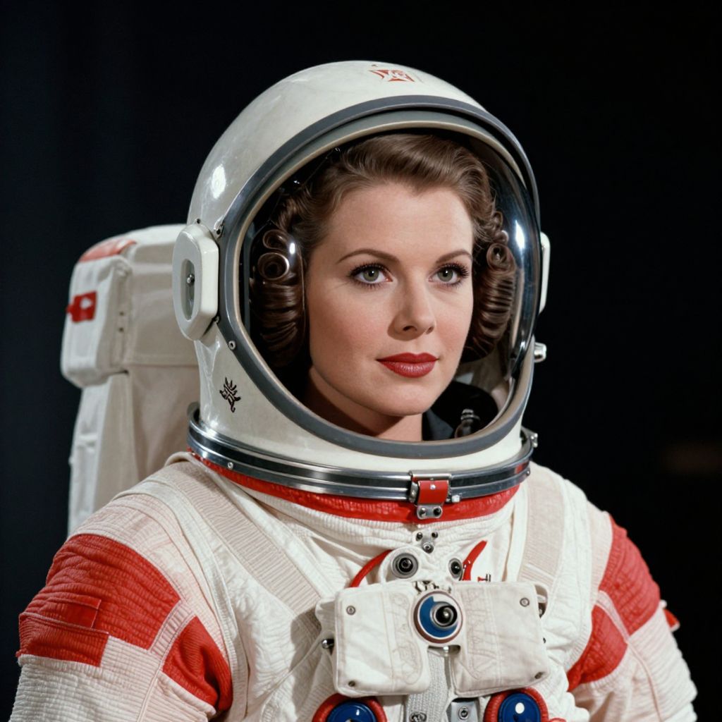 The image depicts a woman wearing a vintage astronaut suit, characterized by its red and white color scheme and detailed helmet with a clear visor. The helmet features various insignias and text, suggesting a historical or commemorative context. The woman's hair is styled in an elegant, updo, adding a touch of formality to the otherwise futuristic attire. The suit appears to be made of a textured fabric, with visible seams and fastenings, indicating its functional design for space travel. The overall composition is centered, with the woman's face and upper body prominently displayed, conveying a sense of determination and pride. The background is dark, which contrasts with the bright colors of the suit, emphasizing the subject and creating a dramatic effect.