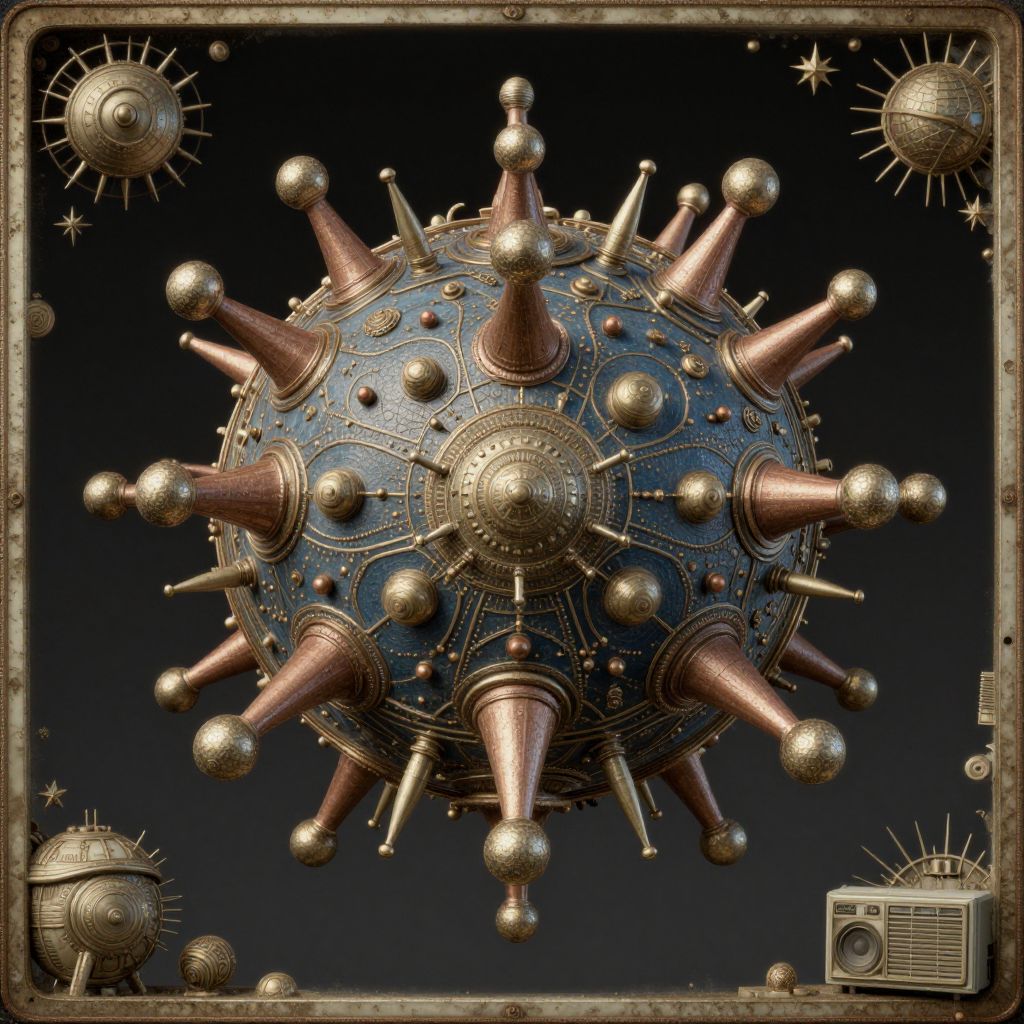 Hyperrealistic steampunk-style mechanical sphere with intricate gold and copper spikes and detailed engravings, set against a dark background. The vintage design includes mechanical elements resembling retro collectibles and a framed display with smaller spherical objects and an old-fashioned radio.