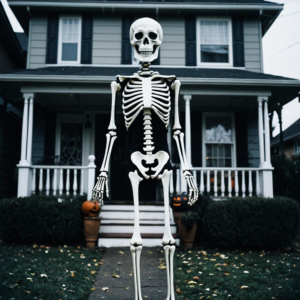 Halloween Fashion Clothing, dressed in a skeleton costume standing in front of a house