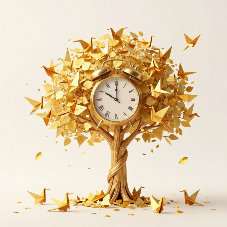 Amidst the ethereal dance of golden origami birds, a clock-shaped tree stands as a poignant symbol of transience, its ticking rhythm transforming leaves into a gentle shower of confetti, evoking a bittersweet symphony of time's relentless march and nature's enduring beauty.