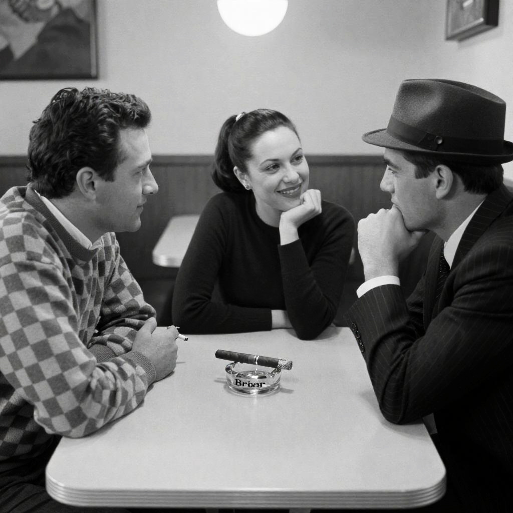 Black-and-white photograph of three people in a diner. Man on left in checkered sweater, man on right in pinstripe suit and fedora, woman in dark sweater, sitting at a table. Woman smiles, men look at her. "Briar" ashtray on table. "Cigars" box on table. Woman has hair in a ponytail. Diner booth in background. Man on left holds cigarette, man on right rests chin on hand.