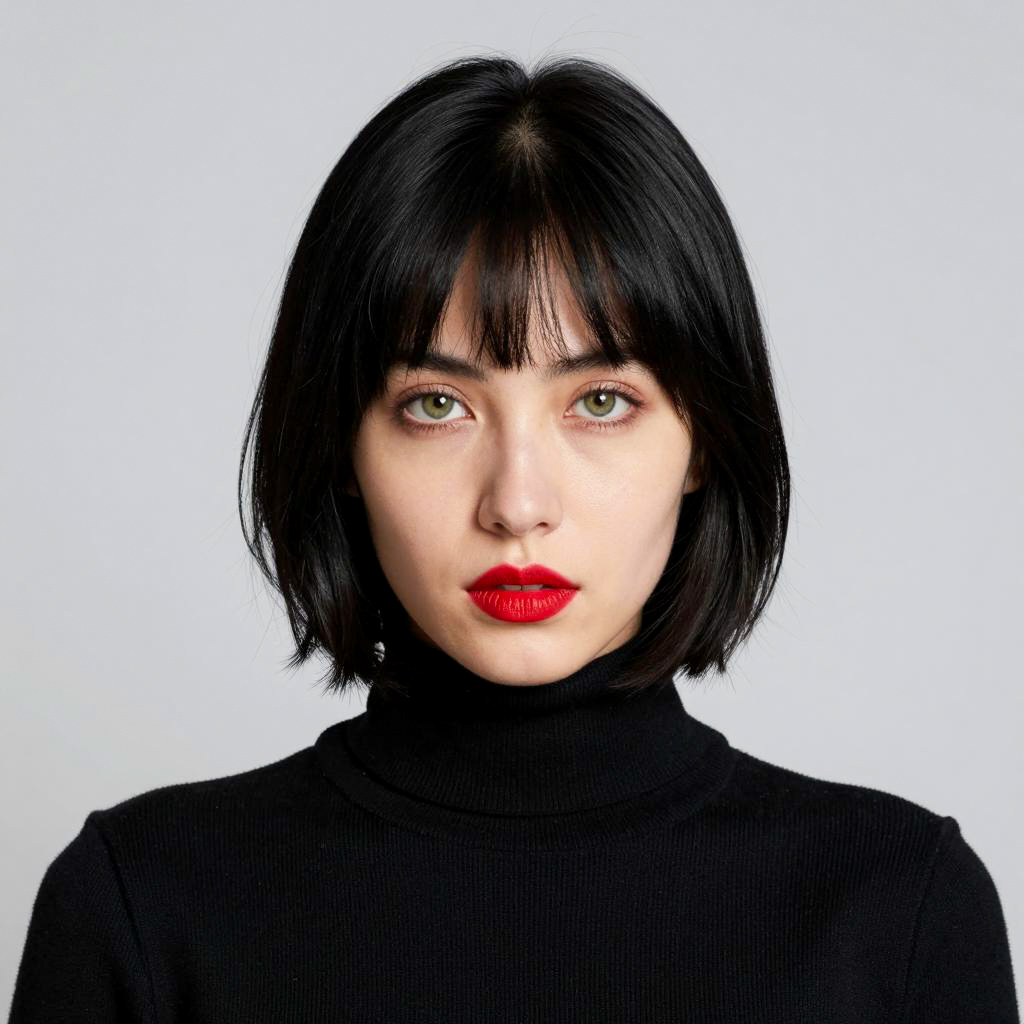 Close-up portrait of a woman with fair skin, short black hair with bangs, and green eyes. She wears bright red lipstick and a black ribbed turtleneck. The background is plain light gray, emphasizing her neutral expression and striking facial features.
