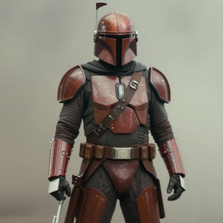 Blur Male Mandalorian with Cadmium colored armor, Spartan helmet design, full body, light fog, wet feel, inspired by Jon Favreau, hard key lighting, cinematic lighting, Kodak Portra effect,