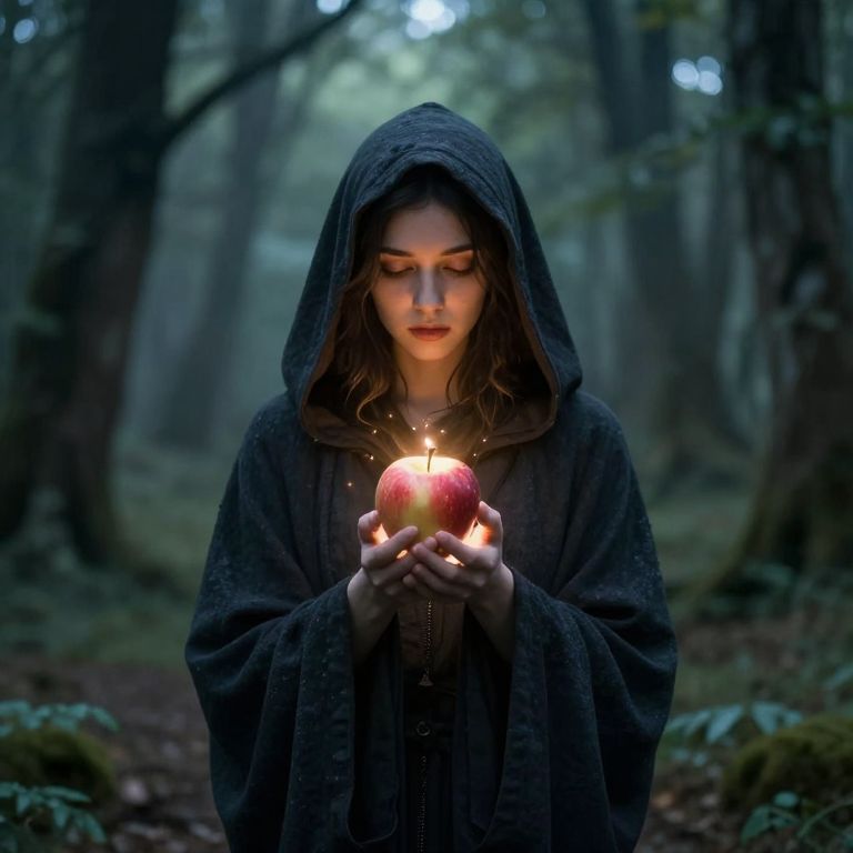 Photorealistic digital art: pale young woman with wavy brown hair, dark hooded cloak, holding glowing apple in dark, misty forest.