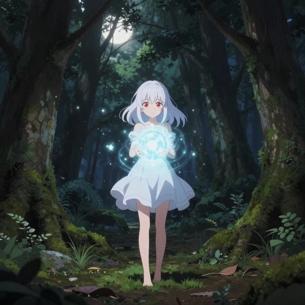 Anime girl with white hair and red eyes holding a glowing magical orb in a dark enchanted forest, mysterious aura surrounding her, ethereal particles floating around, detailed fantasy environment, soft moonlight casting shadows on moss-covered trees