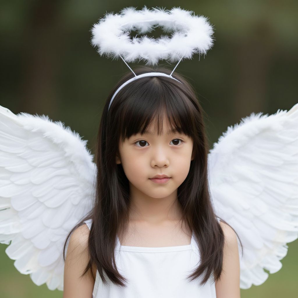 Photograph of an Asian girl with long black hair, wearing white angel wings, halo headband, and dress, standing outdoors.