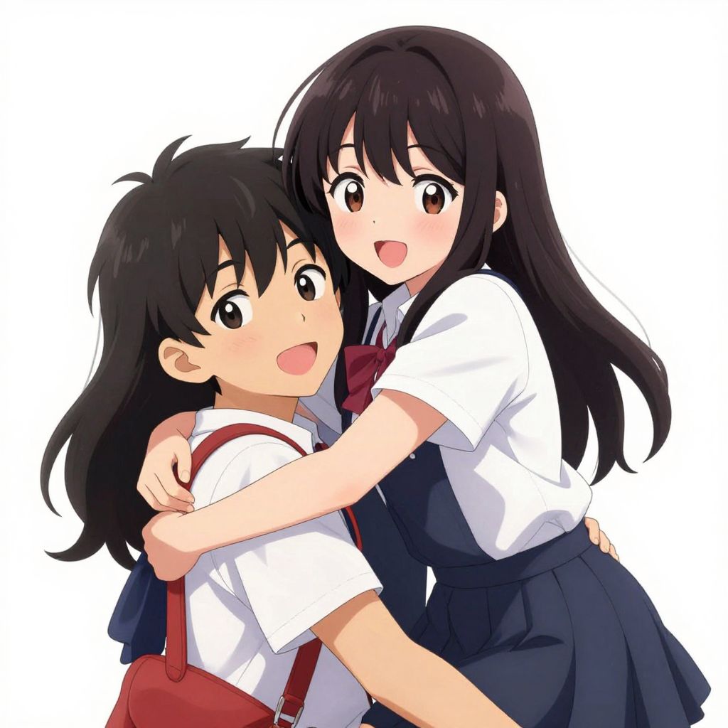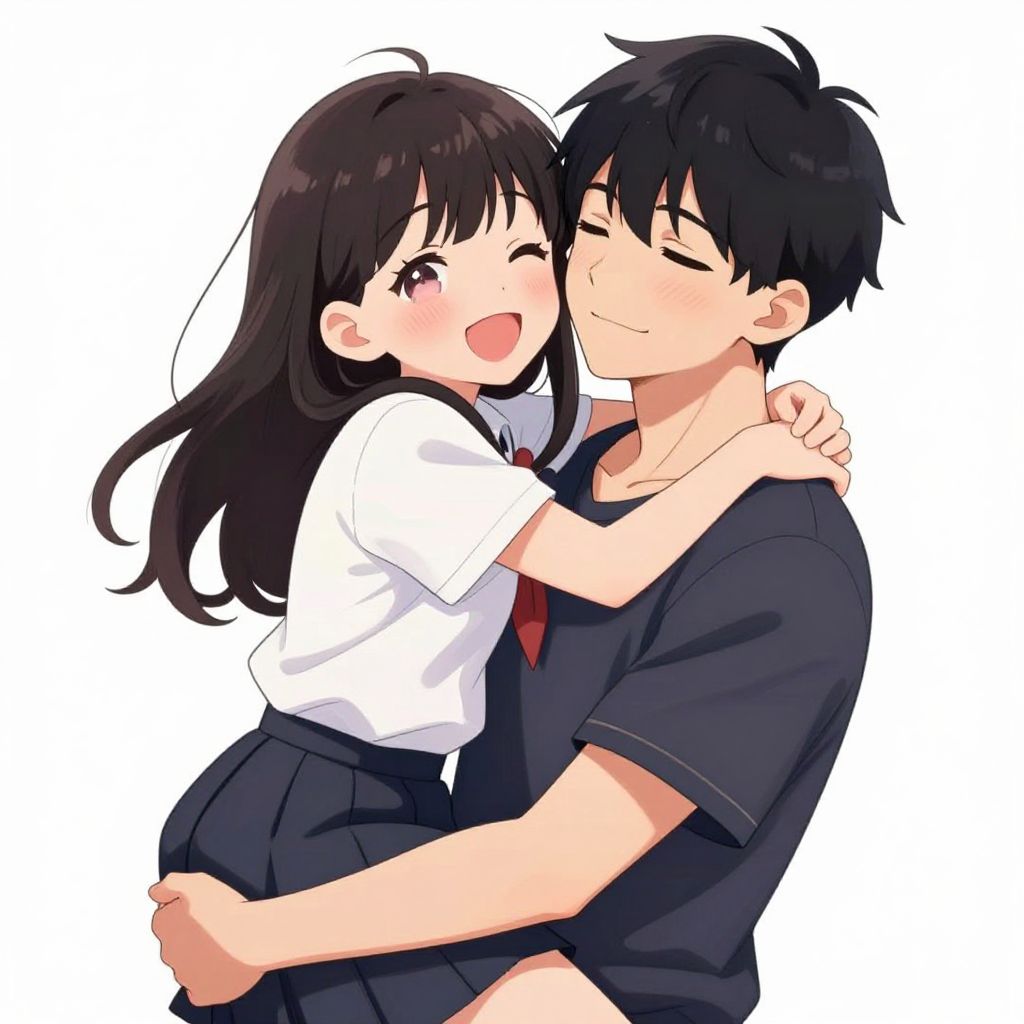A vibrant anime-style illustration featuring a cute couple, with the woman playfully embracing the man, set against a clean white background, showcasing detailed character designs and soft shading typical of high-definition digital art.