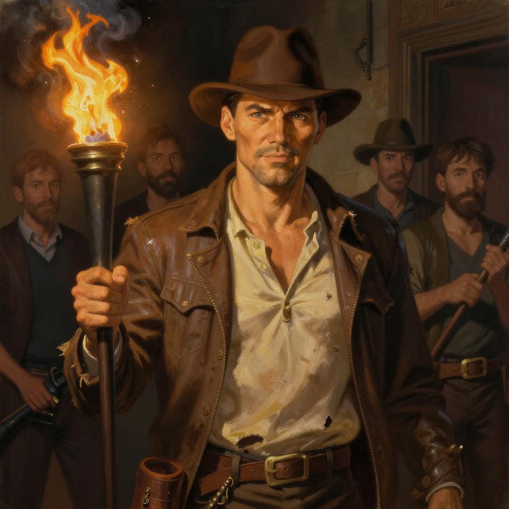 Vintage illustration of an adventure group. Man in white hat and tan shirt on left, blonde woman with curled hair in white shirt in center, young boy with short hair at bottom, two men in hats and shirts walking right. Yellow and blue background. Facial expressions: determined, cheerful. Five people, walking.