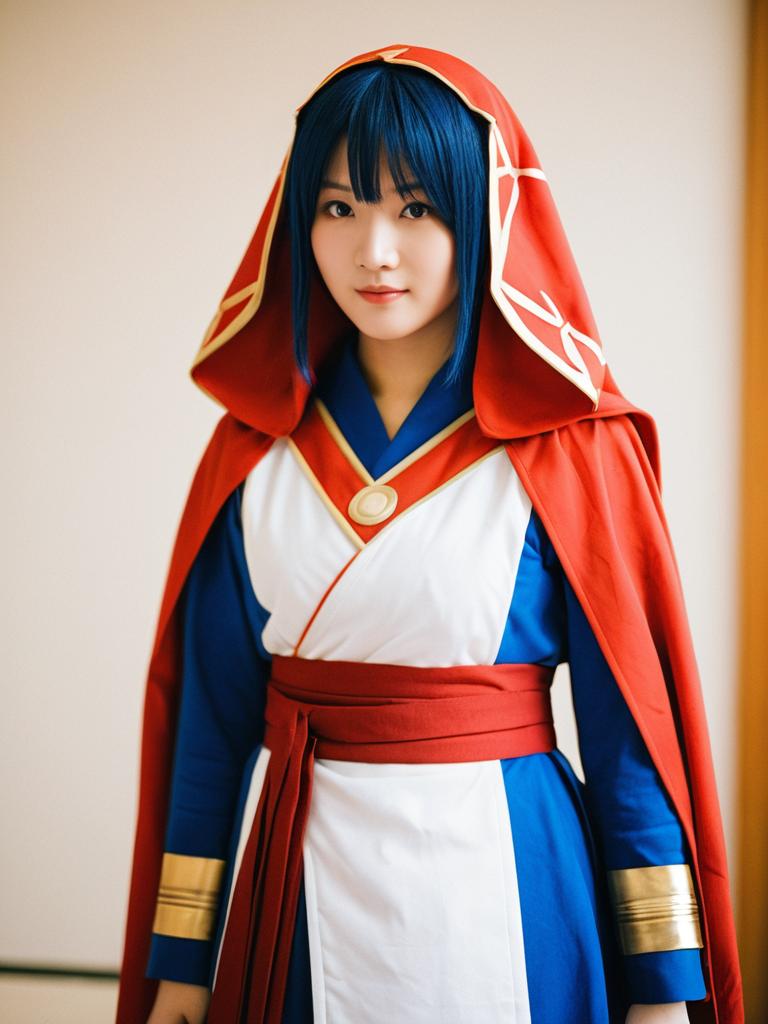 Photo-realistic portrait of a young Asian woman dressed in a detailed Aida Kensuke cosplay costume, featuring a blue wig, a red and white hooded cape, a blue long-sleeve garment with gold cuff details, and a red belt. The image has a softly blurred background with natural warm lighting highlighting the vibrant colors and realistic textures of the costume.