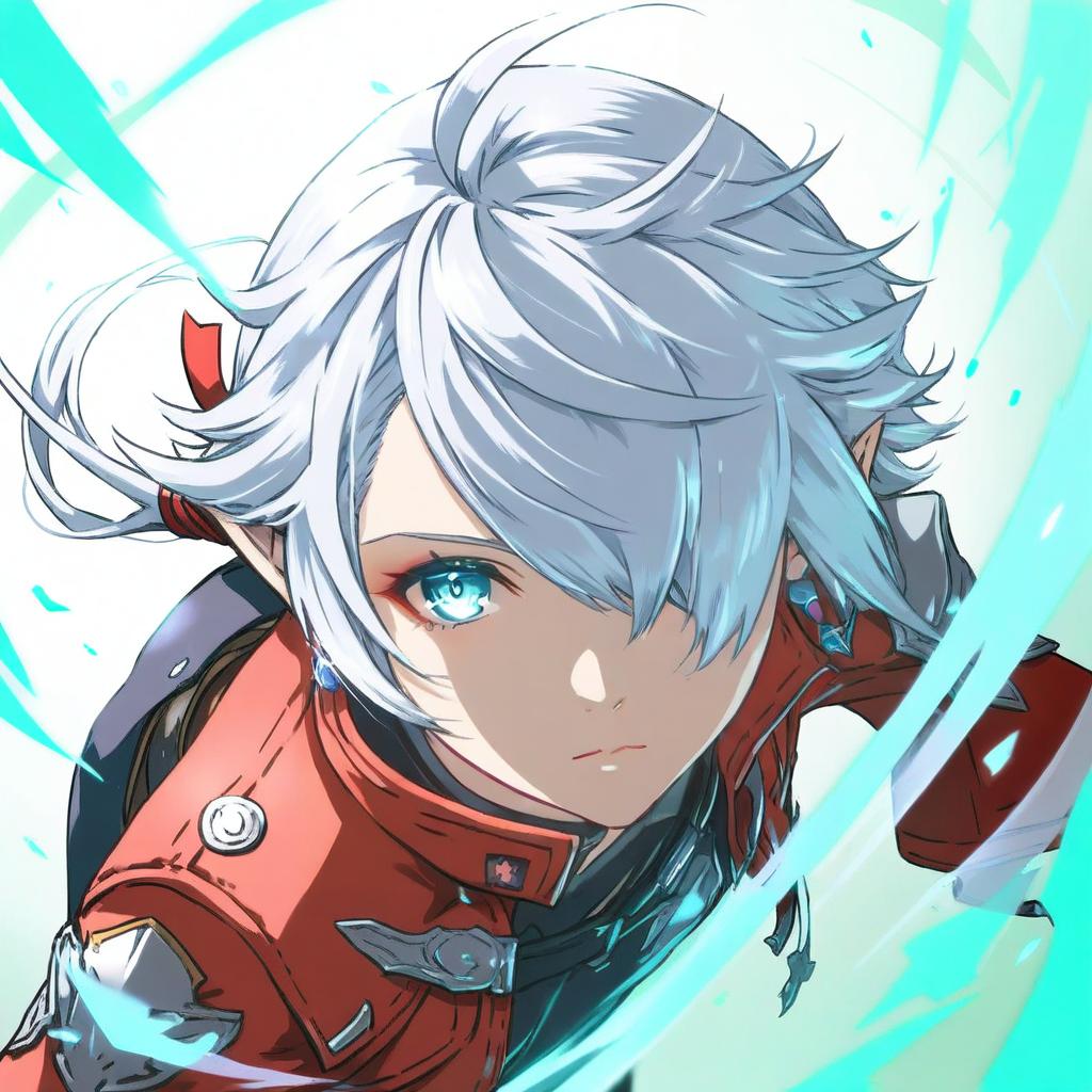 Alisaie leveilleur, final fantasy, 1girl, blue eyes, hair over one eye, white hair, long hair, ahoge, ponytail, hair ribbon, red jacket, earrings, elezen, by artist abo (hechouchou), animagine