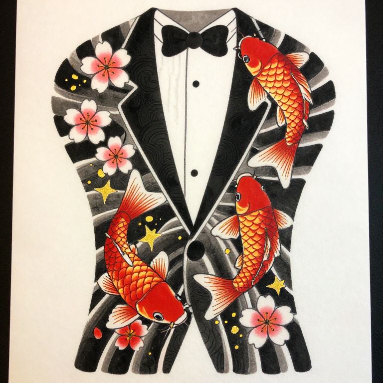 Realistic Japanese tattoo showcasing intricate koi fish swimming amidst traditional cherry blossoms and waves, vibrant color palette, dynamic composition, delicate shading and fine linework, inspired by Edo period art style, hyper-detailed and lifelike.