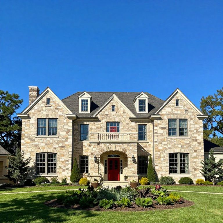 Imposing two-story stone mansion with a grand arched entryway, red front door, and symmetrical design featuring multiple dormer windows, set against a vibrant blue sky and surrounded by meticulously landscaped greenery in Mariposa del Lago, Fort Worth, TX.