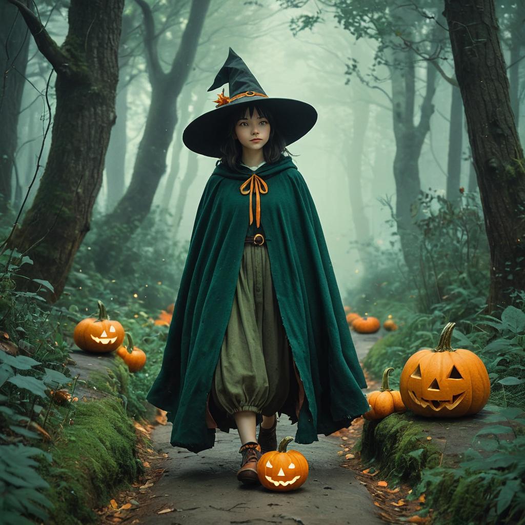 A beautiful coherent image of a young witch in a moonlit pumpkin patch, wearing a purple mage hat, starry cloak, crescent moon pants on an adventure - cover art - magical girl - painted by Greg Rutkowski, masterpiece, artstation