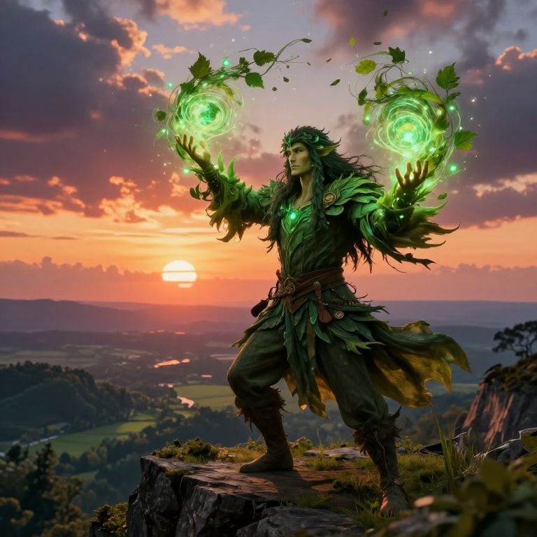 Digital artwork of a green-clad, leafy-crowned wizard with glowing green energy circles in both hands, standing on a rocky cliff at sunset,