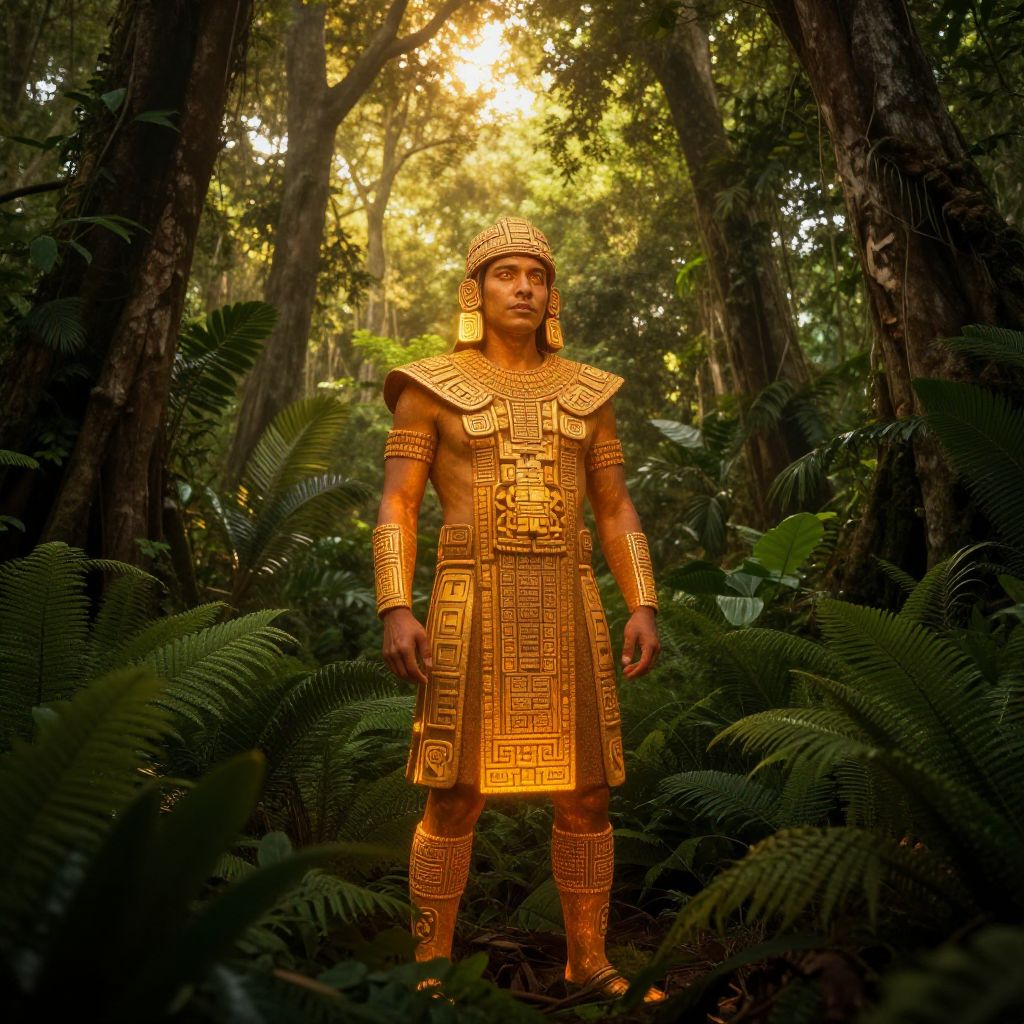 Photograph of a statuesque, dark-skinned man standing in a dense jungle. He is adorned in intricate, golden Mayan-style armor with geometric patterns, including a helmet, shoulder guards, arm bands, and a knee-length tunic. His expression is serious, and he stands with hands by his sides. The background is lush with tall trees and dense ferns, bathed in dappled sunlight filtering through the canopy. The gold armor contrasts vividly with the dark green foliage, creating a striking visual effect. The image has a surreal, almost magical quality, blending historical attire with a natural setting.