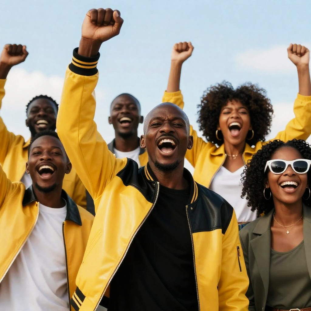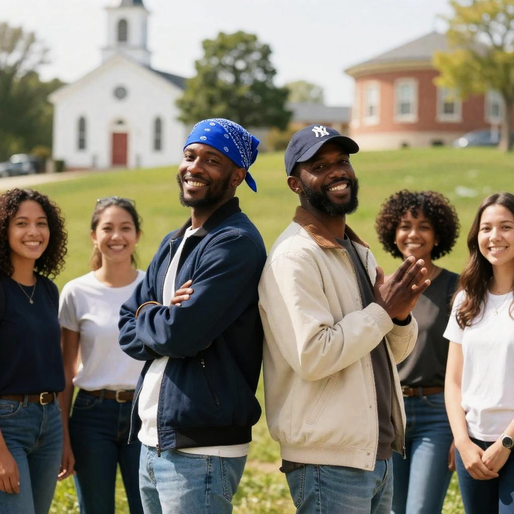 Photograph of five people in front of a grassy hill with buildings. Two black men in the center back-to-back, grinning, one in a blue bandana and jacket, the other in a navy cap and beige jacket, making hand gestures. Three women on the left and right, smiling. Background includes trees, a white church with a steeple, and a round tower. Bright, sunny day.