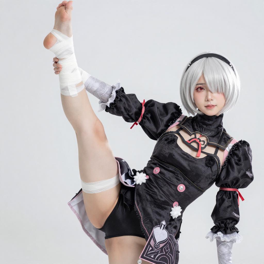 Photograph of a pale-skinned woman with short, silver hair, wearing a black outfit with a pink belt, and pink sandals. She is bound with white bandages on her arms and legs, sitting with legs raised and feet forward. Background includes skulls, pink-lit objects, and dark, shadowy elements. She covers her mouth with her hand, looking distressed.
