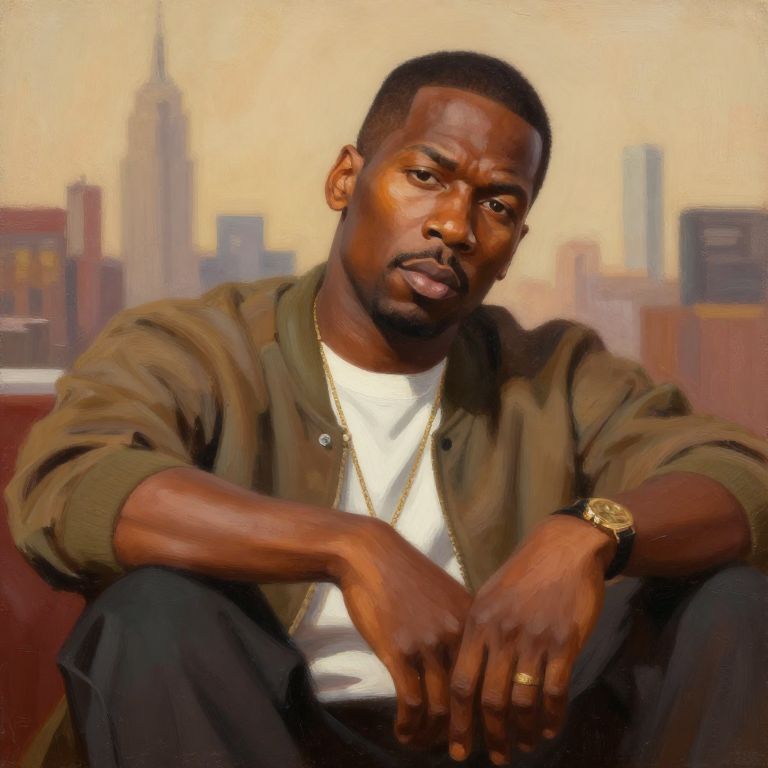 50 Cent portrait painted in oil style, warm tones, soft focus background featuring New York city skyline, relaxed confident pose, classic artistic flair, fine detail on skin and clothing