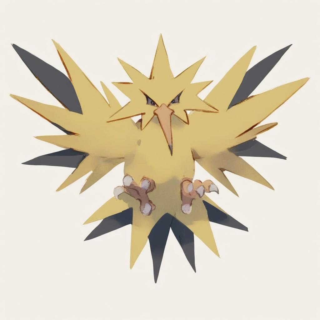 Digital drawing of a bird-like Pokémon with a yellow, starburst-shaped body, resembling a bright sun. It has sharp, dark blue, pointed feathers extending from its back and a triangular, orange beak. The Pokémon's eyes are small and black, giving it a fierce expression. Its feet are small, clawed, and pinkish. The background is plain white, making the vibrant colors of the Pokémon stand out. The style is clean and semi-realistic with a focus on bold, dynamic lines and bright colors.