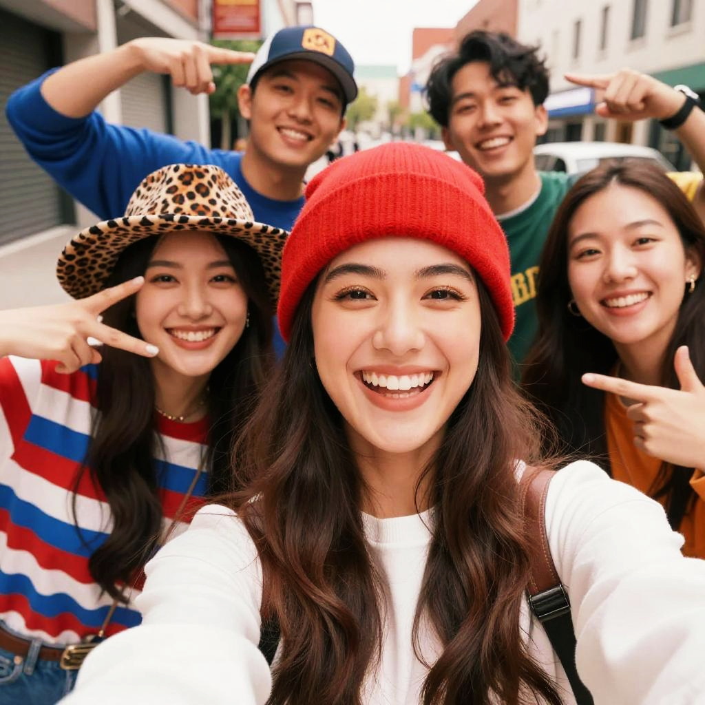 A vibrant, candid photo of four young women taking a selfie outdoors. They're all smiling widely and cheering, with one making a peace sign. The woman in the center has dark hair, a striped shirt, and is holding the camera. The background is slightly blurred, showing a bright, sunny day with trees. The image has a lively, energetic feel.