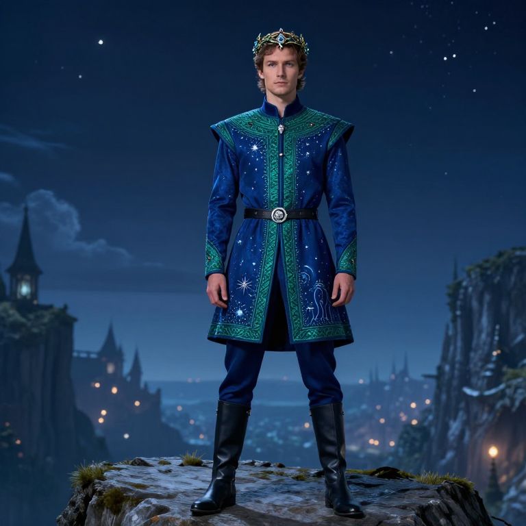 Photograph of a young white male standing on a rocky ledge at night. He has short brown hair, wears a silver tiara, and is dressed in a dark blue, long-sleeved, medieval-style coat adorned with star and constellation patterns, and a black belt with a circular buckle. His pants are dark and he wears black boots. The background features a starry night sky, a distant castle with lit windows, and illuminated city lights. The scene is magical and fantasy-like, with a focus on the character's regal and mysterious appearance.