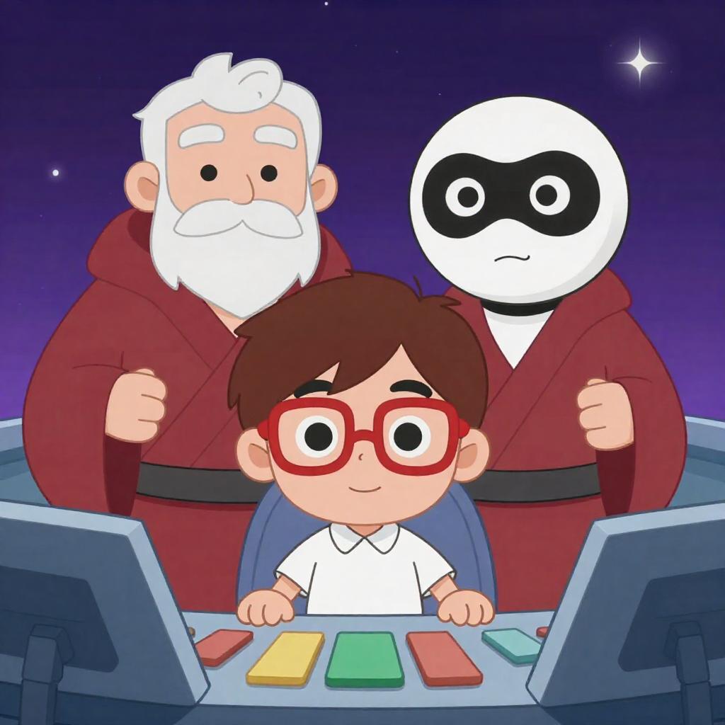 Digital illustration of a colorful, cartoon-style scene. A person with pink earmuffs, round glasses, and a blue shirt stands on a yellow sled with black stars. Four penguin-like characters with different colored hats (red, yellow, green, and pink) stand around the sled. A black and yellow character with a microphone stands on the sled. The background is a blue, snowy ure with white streaks.