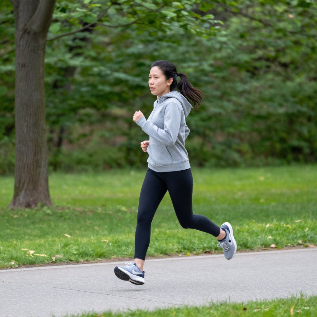 Photograph of an Asian woman jogging on a park path, wearing a gray hoodie, black leggings, and white sneakers, with green trees and grass in