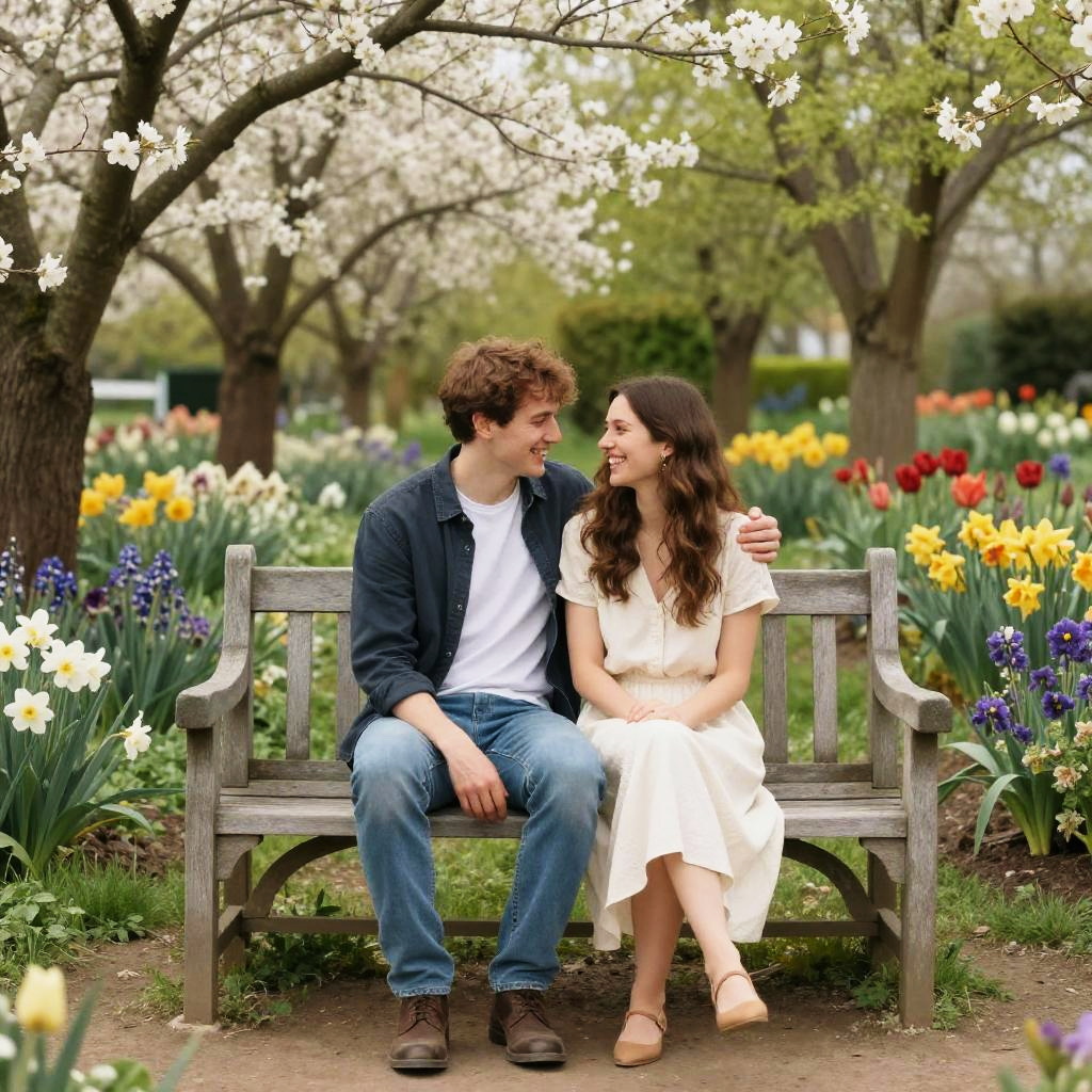 Photograph of a young couple sitting on a wooden bench in a vibrant spring garden. The man, with curly brown hair, wears a blue jacket over a white t-shirt and blue jeans, smiling at the woman. She has long, wavy brown hair, wears a white, short-sleeved dress, and tan sandals. They are surrounded by blooming flowers, including yellow, white, and purple tulips, and red and yellow daffodils. White blossoming trees form a delicate, natural arch overhead. The background is a lush, green garden with a path and more trees. The couple's expressions and body language suggest affection and happiness.