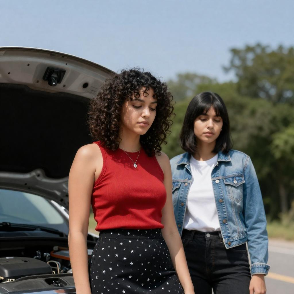 Photograph of two women standing outdoors beside an open car hood. The woman in front has curly dark hair, red sleeveless top, black skirt with star pattern, and necklace. The woman in back has straight dark hair, blue denim jacket, white shirt. Both look down, expressions neutral. Bright blue sky, green trees in background.