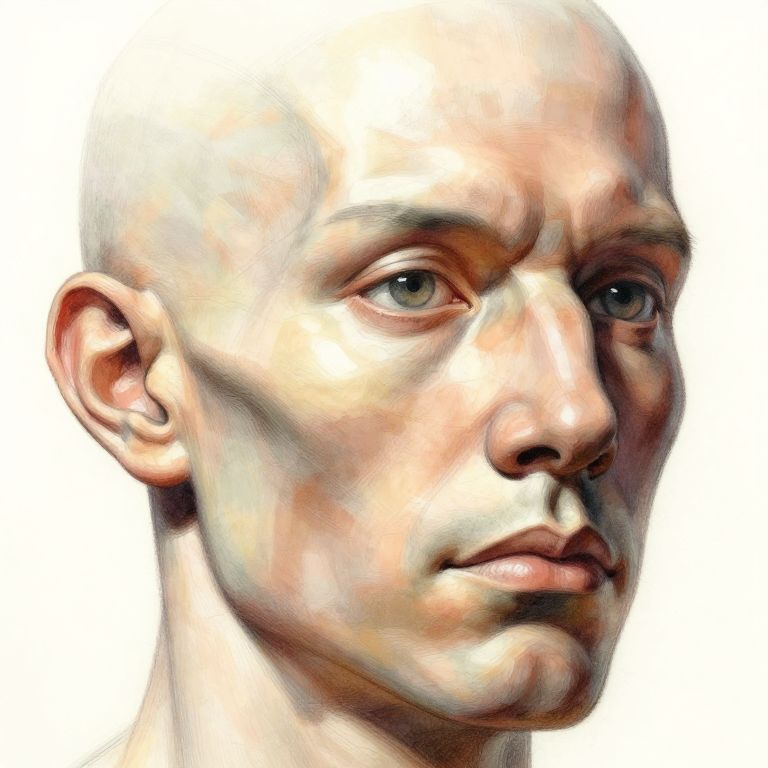 This is a highly detailed, digital painting of a bald, Caucasian man with a serious expression. The artwork features realistic textures and shading, highlighting the man's smooth, fair skin and prominent facial features, including a strong jawline, high forehead, and slightly furrowed brows. His blue eyes are directed slightly to the left, and his lips are slightly parted. The background is a plain white, which makes the subject stand out. The light and shadow are expertly used to create a three-dimensional effect, giving the portrait a lifelike quality. The style is hyper-realistic, focusing on minute details and lifelike representation.