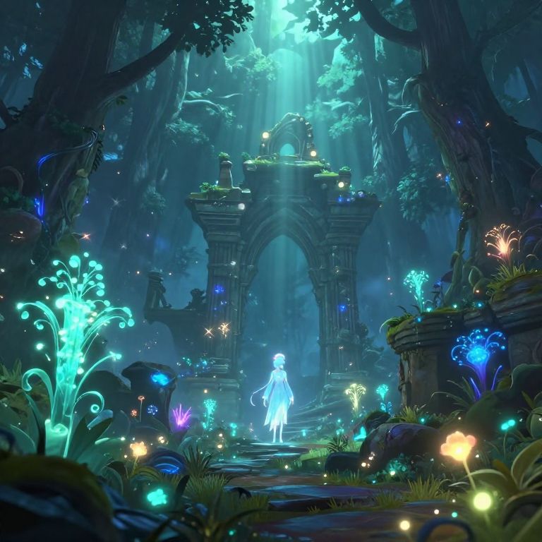 Android a girl meets a beautiful, friendly, glowing fairy on an alien planet, detailed technology, wide angle, cinematic, unreal engine,