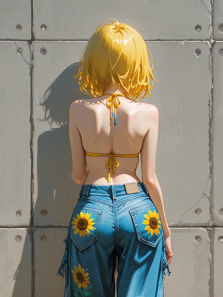 Rear view of a young woman with short bright yellow hair wearing a stylish sunflower yellow wrap bikini top paired with casual cropped denim pants featuring sunflower prints on back pockets. The pants have a frayed hem and side slits, styled in lightweight chambray fabric with playful tie-dye accents. The scene is set against a textured concrete wall.