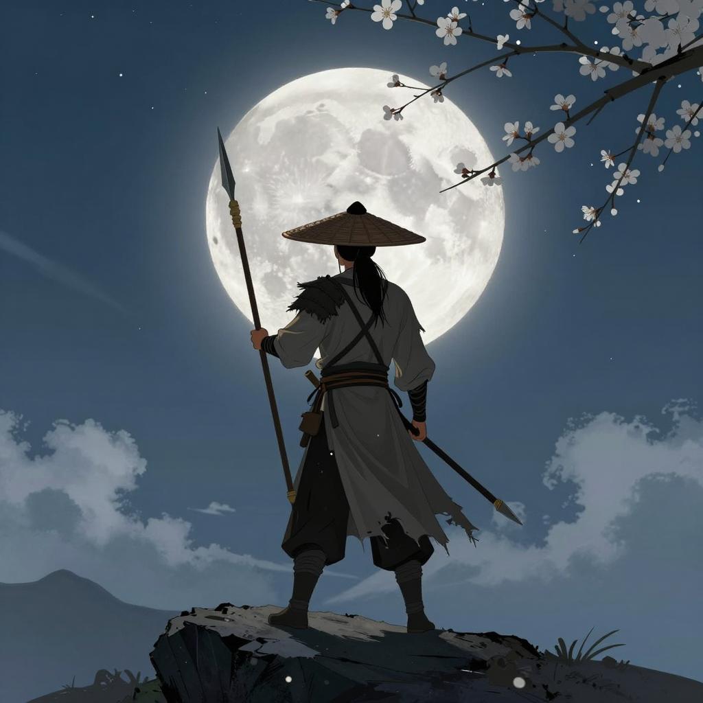 Silhouette of a ninja with a katana, crouched on a rooftop, back facing the viewer, against a large full moon. Dark blue sky with small stars, red clouds at the bottom. Digital illustration.