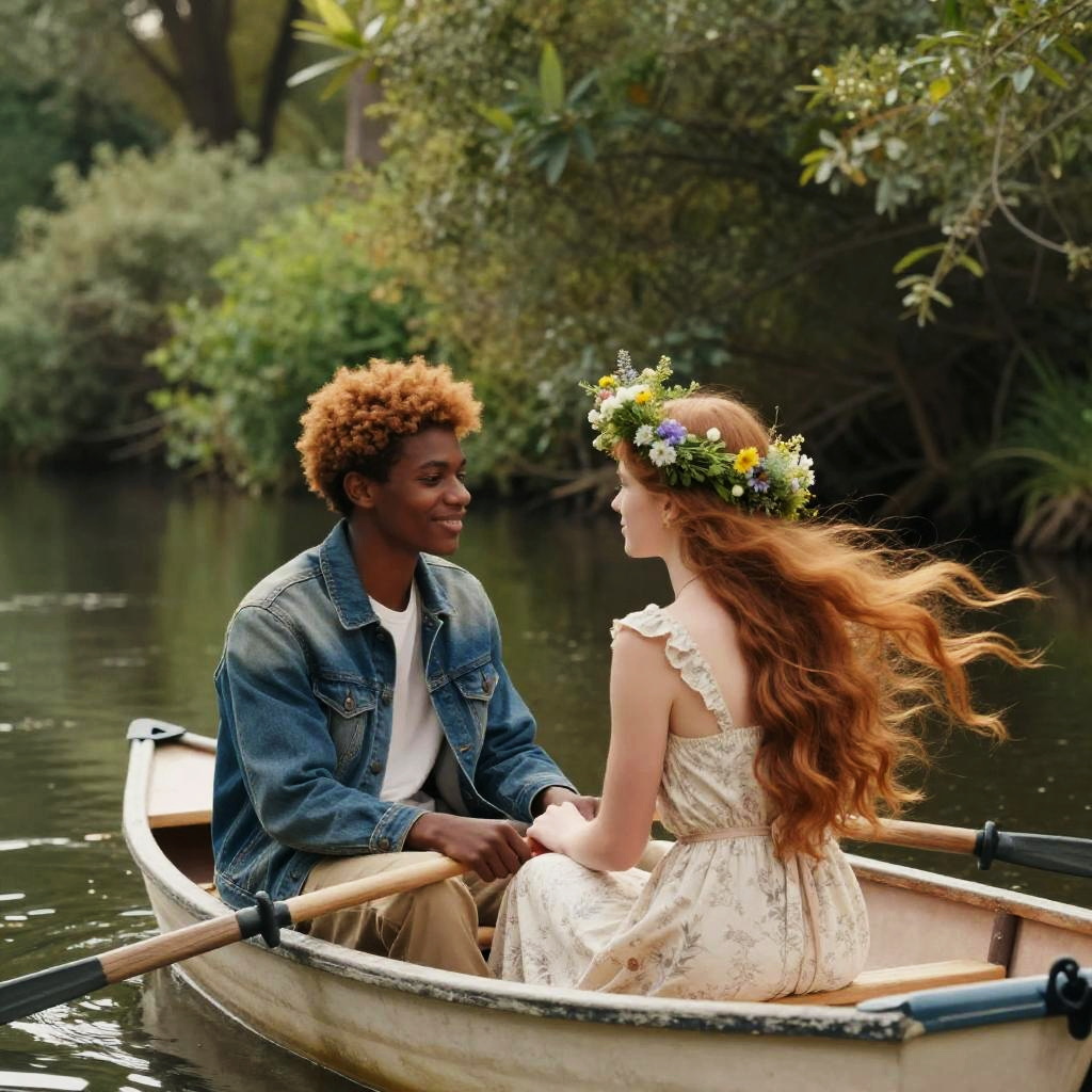 A young interracial couple, the boy in a denim jacket and the girl wearing a crown of wildflowers are drifting peacefully on a small rowboat, surrounded by lush greenery along a serene river. The boy has short tousled auburn hair while the girl has long flowing auburn hair that catches the light. Atmospheric lighting enhances the romantic mood, captured in a long shot that showcases intricate details in a style reminiscent of John William Waterhouse, perfect for sharing on Instagram.