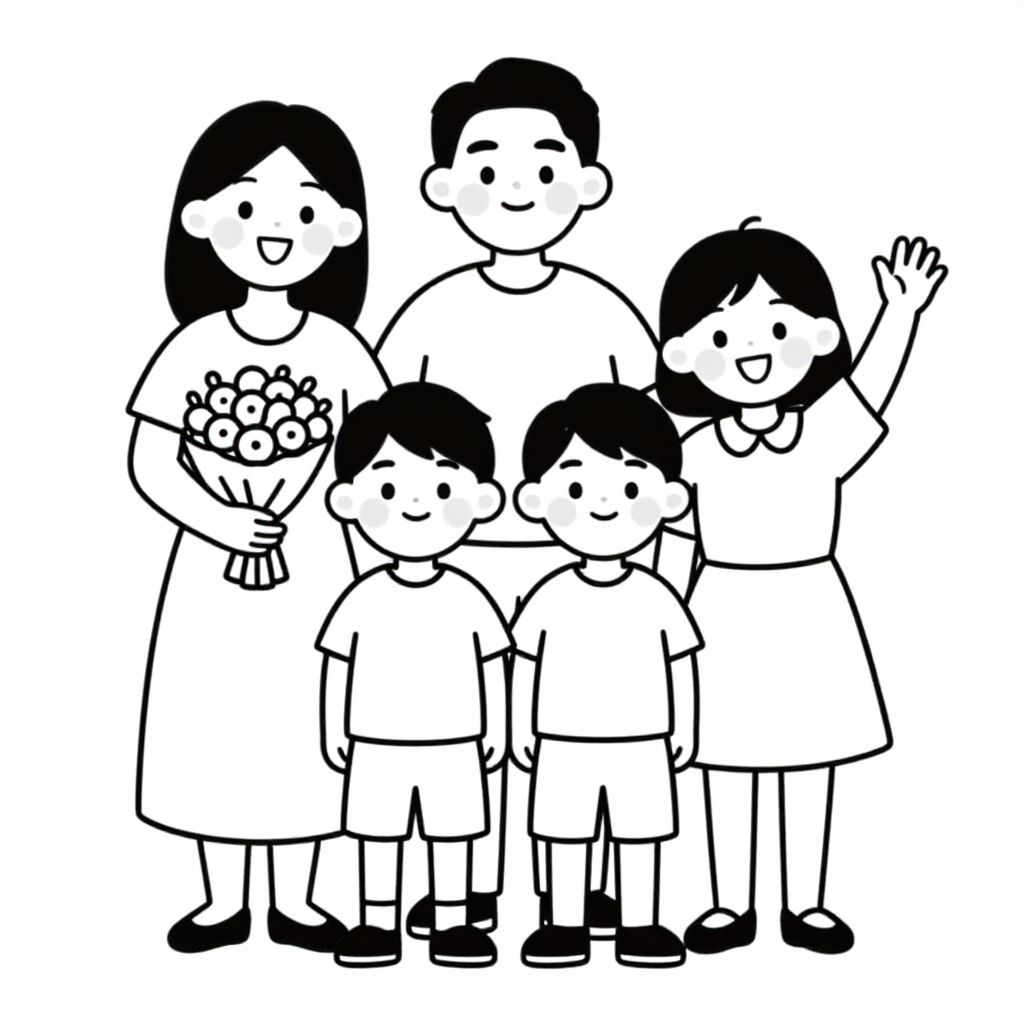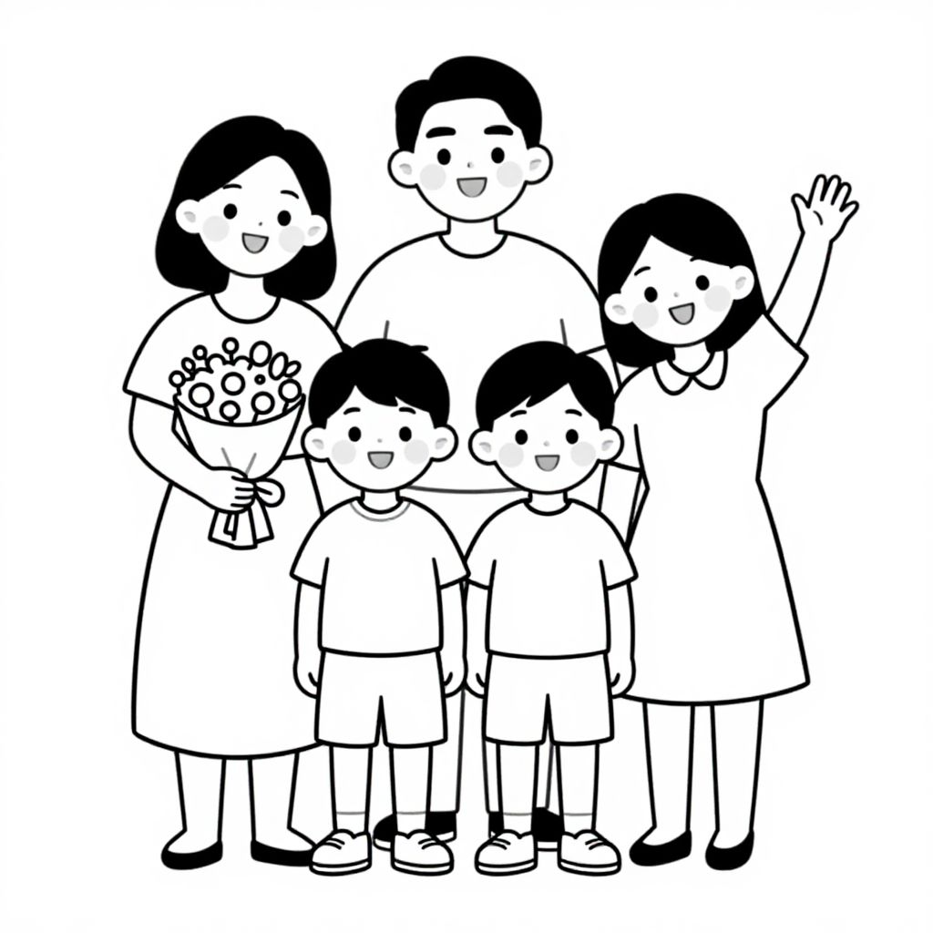 Family members stand together joyfully, with a smiling woman on the left holding a bouquet, two boys in the center, and a girl on the right waving cheerfully, all depicted in a simple black-and-white line drawing style.