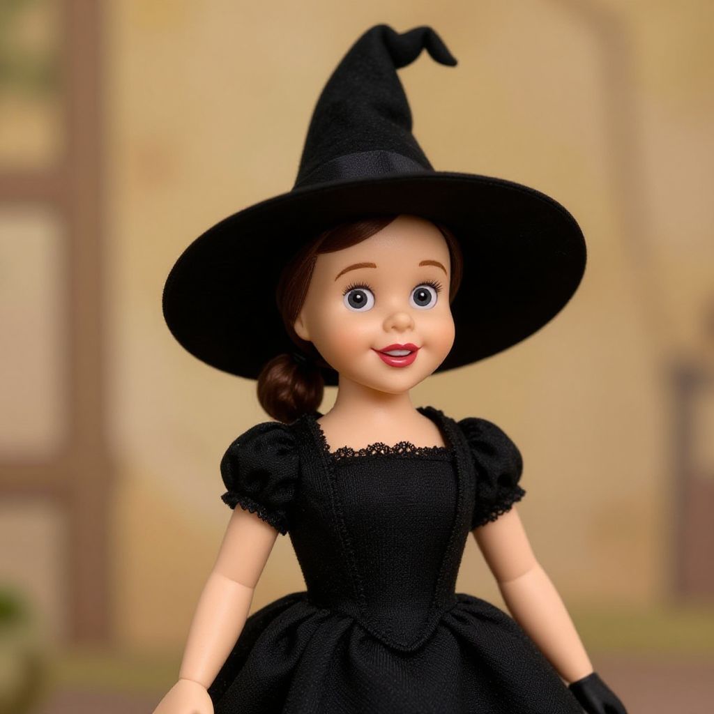 "Winnie Witch, woman in a black hat and dress with a black hat"