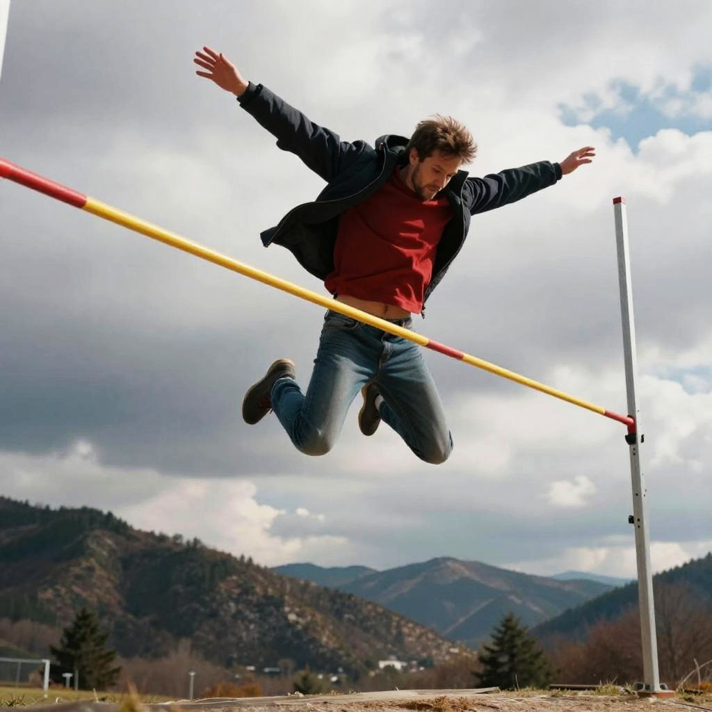 Photograph of a man in red shirt and blue jeans mid-air, jumping over a yellow and red horizontal bar, set against a cloudy mountain backdrop.