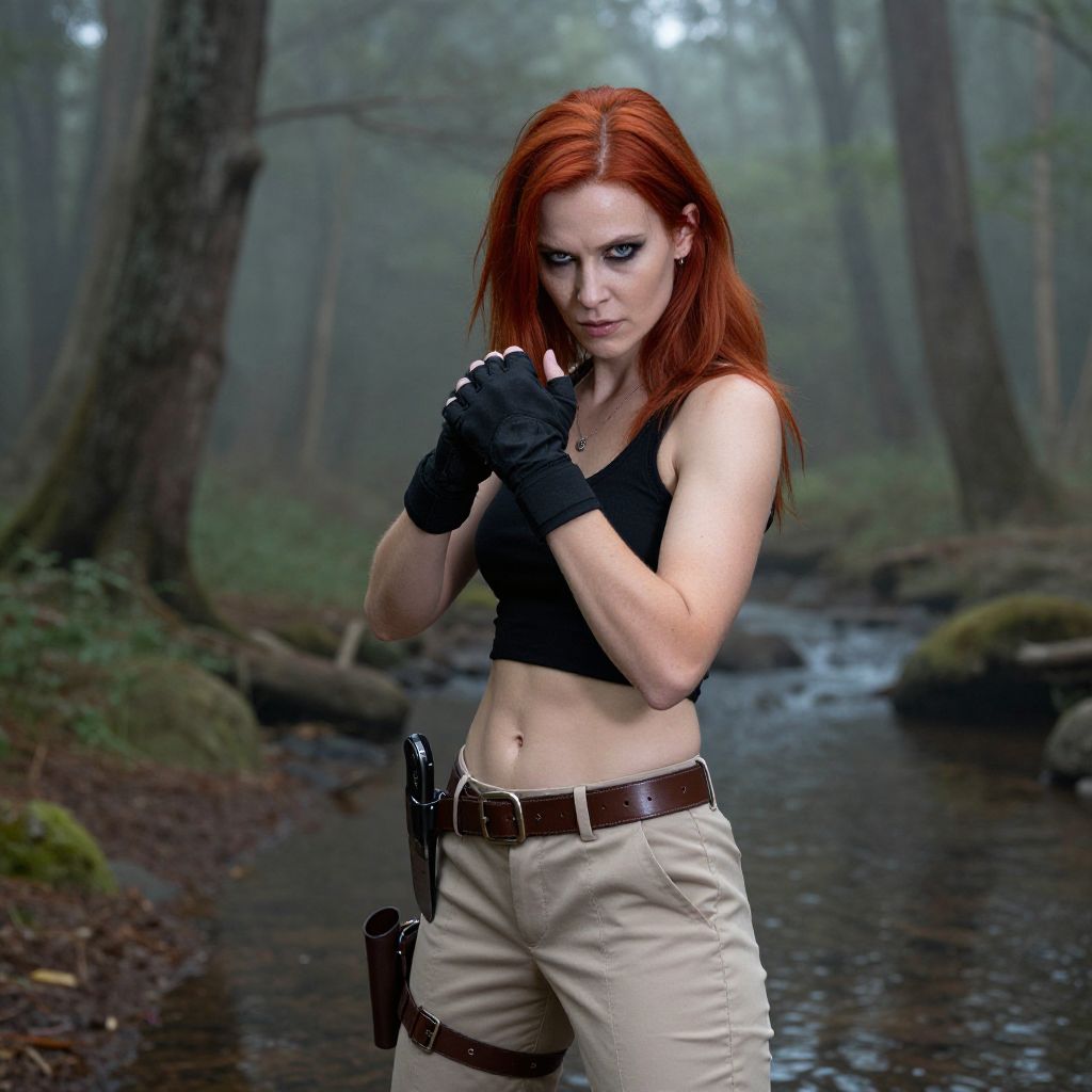 Photograph of a fierce-looking woman with bright red hair and pale skin standing in a misty forest. She's wearing a black crop top, beige pants, and black fingerless gloves, with a brown belt and a holstered knife at her waist. Her hands are up in a fighting stance, and she has a determined expression. The background shows tall trees and a reflective stream.