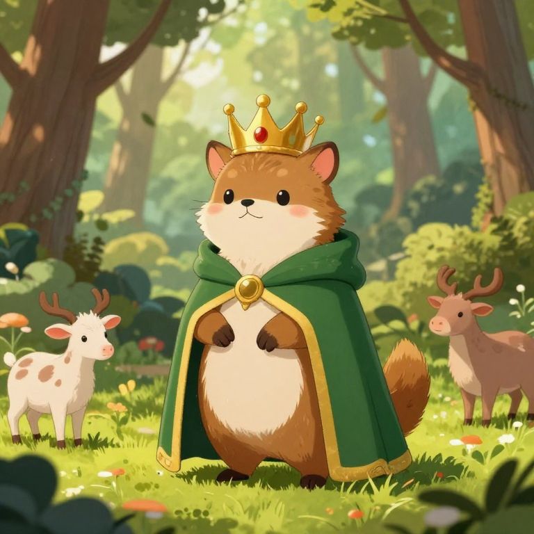 An anthropomorphic forest critter, adorned with a golden crown and a green cloak, stands regally in a soft, natural-lit enchanted forest, surrounded by pastoral animals.