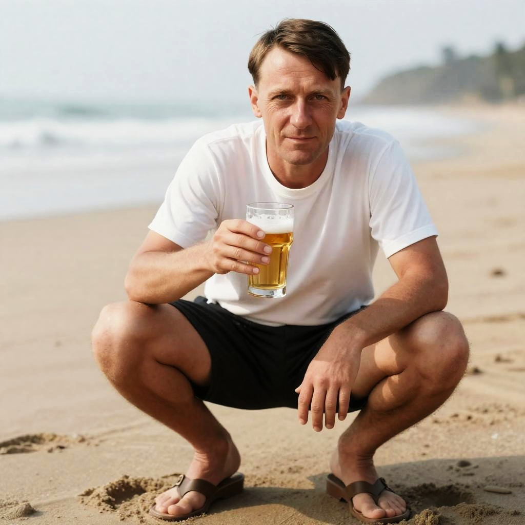 Hitler, a man, ((Goa beach)), Goa, white T-shirt, looks at camera, black shorts, glass of beer, ((smiling)), Masterpiece, best quality, photography, detailed skin, realistic, photo-realistic, 8k, highly detailed, full length frame, High detail RAW color art, diffused soft lighting, shallow depth of field, sharp focus, hyperrealism, cinematic lighting