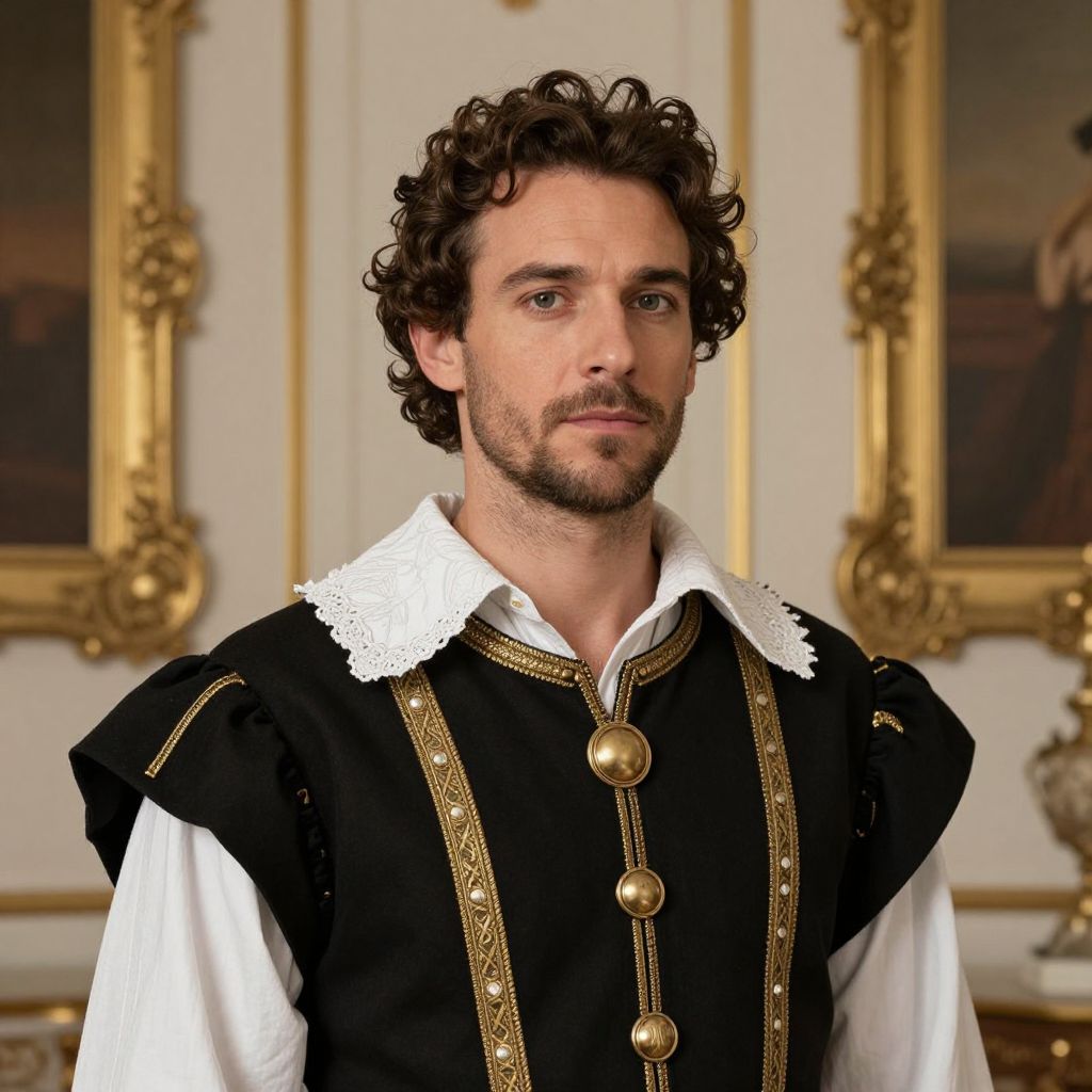 Photograph of a middle-aged white man with curly dark brown hair and a trimmed beard, wearing a black Renaissance-style vest with gold trim and large circular buttons over a white shirt with a lace collar. He has a serious expression and is standing in an ornate room with gold-framed paintings on the wall in the background. The vest features intricate patterns and the shirt's collar is delicately embroidered. The lighting highlights his facial features and the rich textures of his clothing. The overall style is reminiscent of historical European fashion.