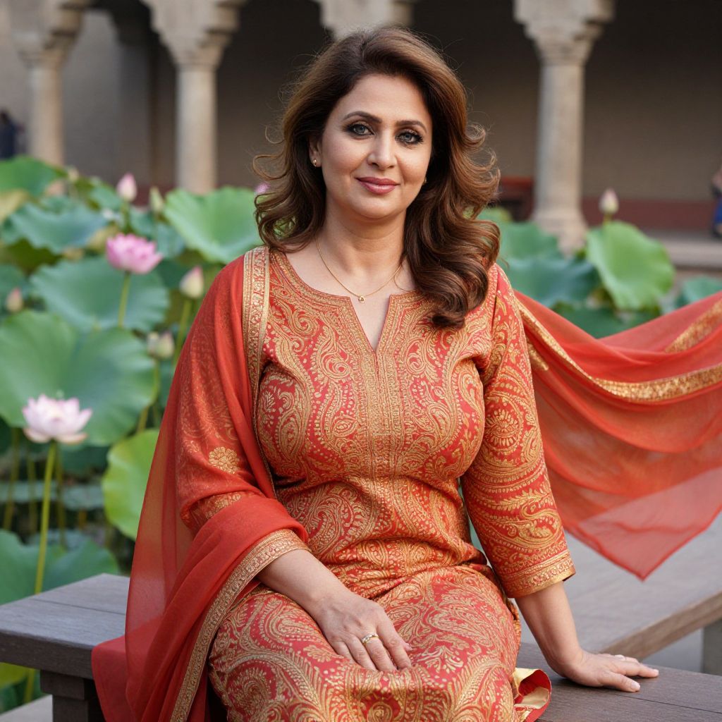 A realistic portrait of a middle-aged woman with a friendly smile, soft gray eyes, and wavy brown hair, dressed in a finely tailored same print salwar kameez with a bold paisley design in shades of red and gold, sitting on a wooden bench in a heritage garden in Varanasi, surrounded by lotus flowers and ancient stone pillars, the fabric flowing gently in the breeze.. The woman has big tits and cute face