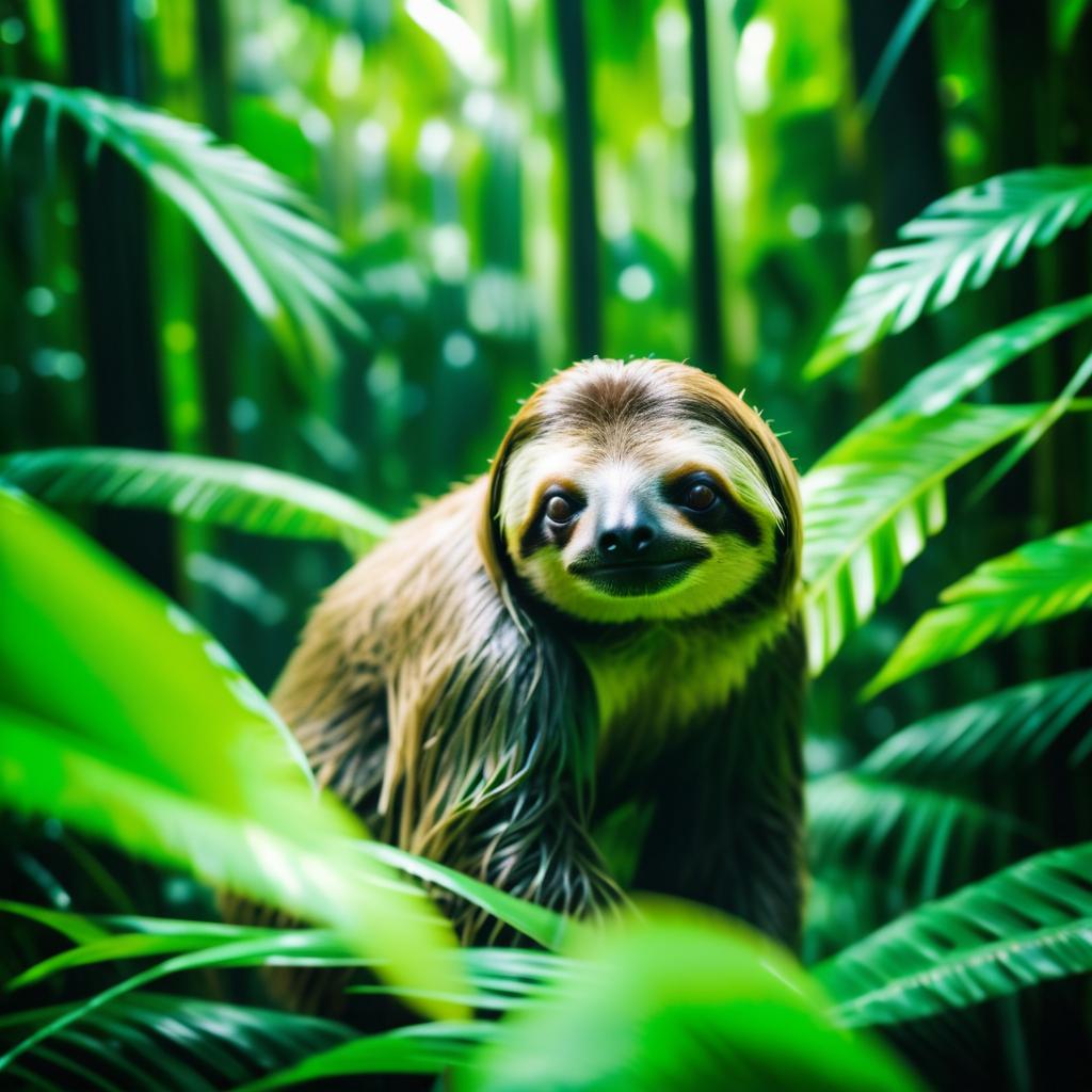 Blurry Polaroid of a sleepy sloth standing in a lush green rainforest, realistic lighting, 4K Ultra HD.
