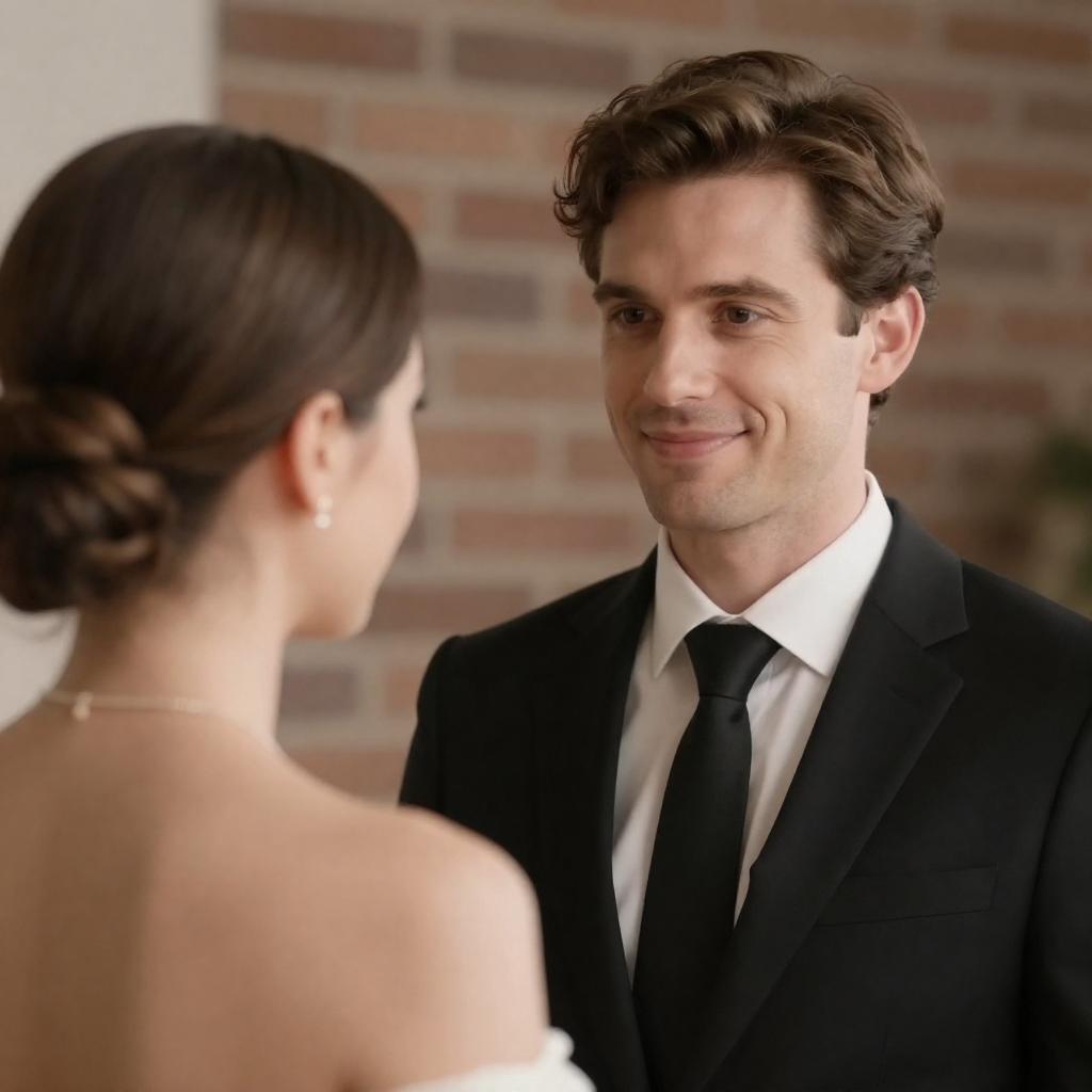Photograph of a man and woman. Man in white suit, green tie, standing, looking down. Woman with dark hair, red dress, earrings, looking up at man. Background: dark door, green wall. Woman's arm tattoo visible. Both in close-up.