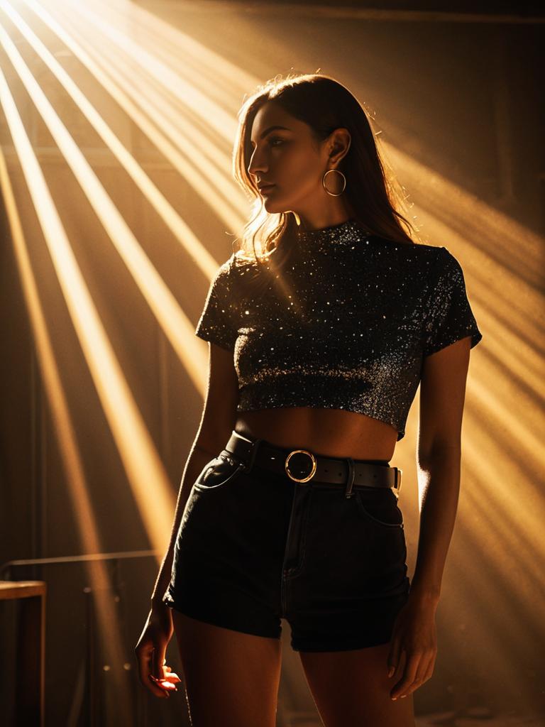 Portrait of a woman wearing a chic glittery black cropped top with short sleeves and a high neckline, paired with plain black high-waisted shorts and a thin leather belt with a minimalistic buckle. She accessorizes with large hoop earrings. Warm, dramatic lighting with rays of sunlight creates a stylish and elegant atmosphere.