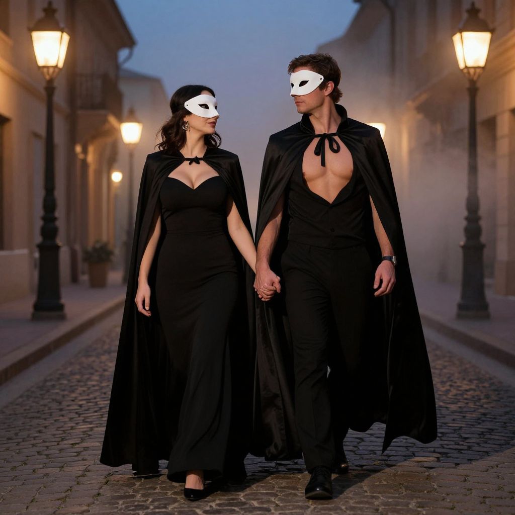 A couple, black costume, twilight photography, dusk colors, soft glow, elegant attire, dramatic capes, mysterious masks, holding hands, serene expressions, dimly lit street, vintage lampposts, cobblestone path, gentle mist, shadows playing, romantic atmosphere Sexy. Pretty face and beаutiful eyes. Big breasts