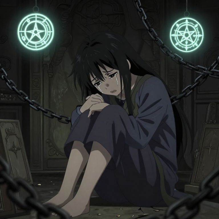 Anime kidnapped scenario inside a dimly lit room, chains and glowing magical seals, distressed captive with tears, intricate background details, atmospheric shadows, emotional intensity